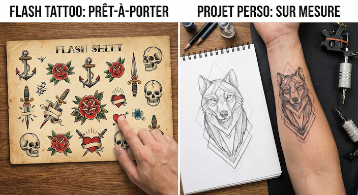 Tu hésites entre un flash tattoo disponible tout de suite et un projet personnalisé sur mesure ? On t'explique la différence et comment faire le bon choix.