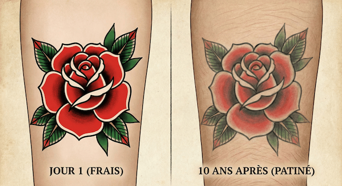 On a tous en tête l'image du vieux tatouage de marin, devenu vert et illisible sur un bras fripé. Du coup, c'est légitime d'avoir peur que ton superbe motif finisse en tache baveuse.