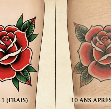 Le noir : Il peut virer au gris ou au bleu s'il est trop exposé sans protection. La solution ? Crème solaire indice 50. Toujours. C'est le meilleur anti-rides de ton tatouage.